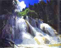 扎嘎瀑布--享有中華第一鈣化瀑布之美譽。景區溝長5公里,瀑布高104米,寬35米,以每秒23米的流速從巨大的鈣化梯坎飛瀉而下,聲震數里,氣勢磅礴。遠看宛如千條銀色的哈達從天際飄逸而下;近看似萬斛珍珠在自然的琴弦上跳躍。隨風輕飄的水霧瀰漫整個山谷,夏季瀑布被道道彩虹裝點;冬季則掛上華光閃爍,氣派非凡,晶瑩剔透的冰簾。整個瀑布一瀉三階,在一階中央有一水簾溶洞。洞內大廳高6米,面積約50多平方米。廳中鐘乳遍布,似寶塔,似竹筍,玲瓏剔透,形象逼真。在瀑布下游約4公里的山溪內,清澈的流水隨地勢的高低落差渾然而為串珠似的環形彩池,池水從魚鱗疊置的環形鈣華堤坎上翻滾下來,跌宕成層層疊疊的環形瀑布,一池一瀑,珠連玉串,蔚為奇觀。流水淙淙和著鳥兒的啁啾,在樹叢中,地面上縈迴宛轉。